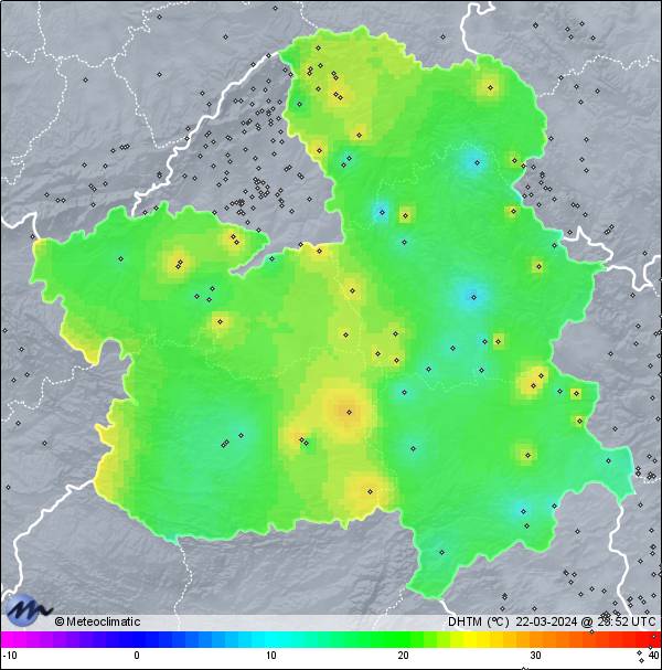| 22-03-2024 | | | Máx. | Mín. | | | Temperatura | 28,9 | 9,8 | °C | | Humedad | 82 | 26 | % | | Viento | 24 | n/a | km/h | | Presión | 1.019 | 1.014 | hPa | | Precipitación | 0,0 | mm |
