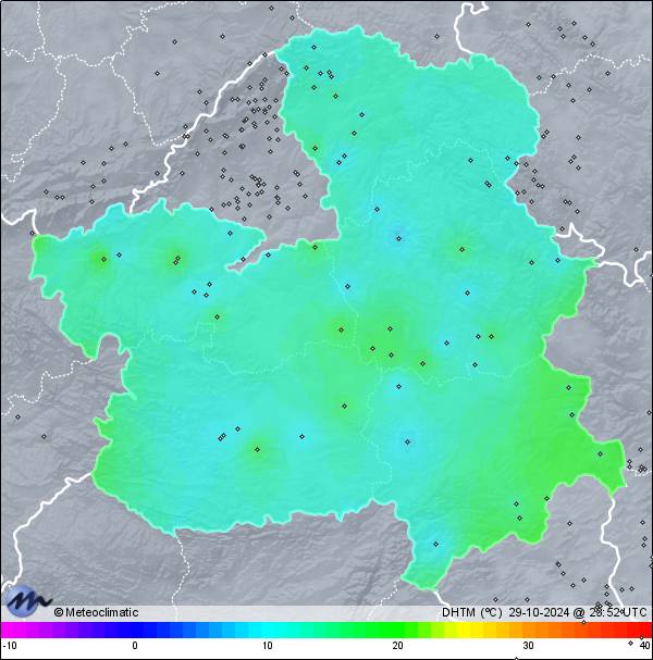 | 29-10-2024 | | | Máx. | Mín. | | | Temperatura | 16,8 | 10,2 | °C | | Humedad | 97 | 83 | % | | Viento | 40 | n/a | km/h | | Presión | 1.038 | 1.030 | hPa | | Precipitación | 0,0 | mm |