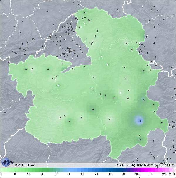 | 03-01-2025 | | | Máx. | Mín. | | | Temperatura | 12,5 | -2,1 | °C | | Humedad | 95 | 53 | % | | Viento | 39 | n/a | km/h | | Presión | 1.033 | 1.025 | hPa | | Precipitación | 0,0 | mm |