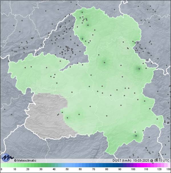 | 09-03-2025 | | | Máx. | Mín. | | | Temperatura | 9,8 | 2,5 | °C | | Humedad | 96 | 72 | % | | Viento | 37 | n/a | km/h | | Presión | 1.002 | 999 | hPa | | Precipitación | 9,5 | mm |