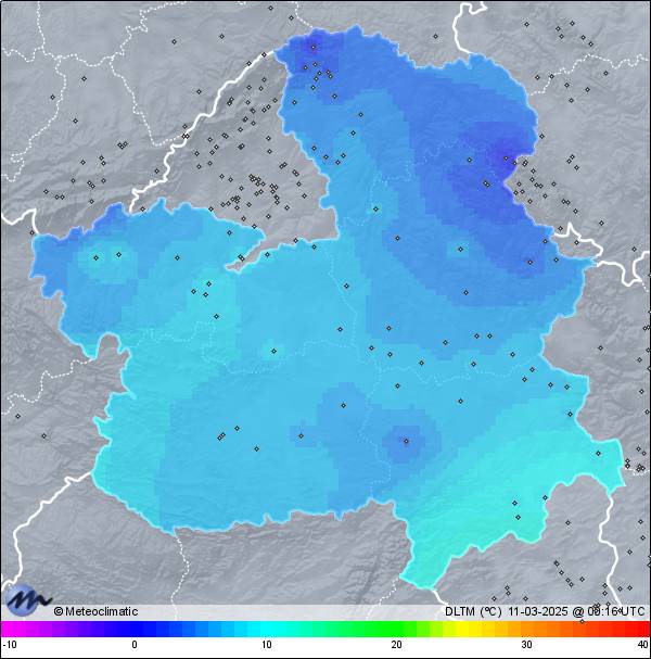 | 10-03-2025 | | | Máx. | Mín. | | | Temperatura | 10,9 | 4,2 | °C | | Humedad | 96 | 71 | % | | Viento | 39 | n/a | km/h | | Presión | 1.007 | 1.002 | hPa | | Precipitación | 9,6 | mm |