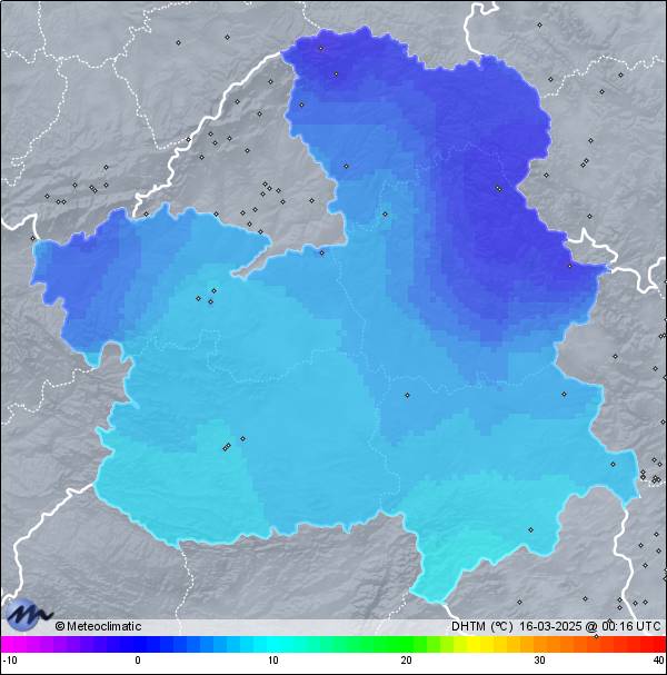 | 15-03-2025 | | | Máx. | Mín. | | | Temperatura | 9,3 | -5,0 | °C | | Humedad | 96 | 44 | % | | Viento | 39 | n/a | km/h | | Presión | 1.014 | 1.007 | hPa | | Precipitación | 0,0 | mm |