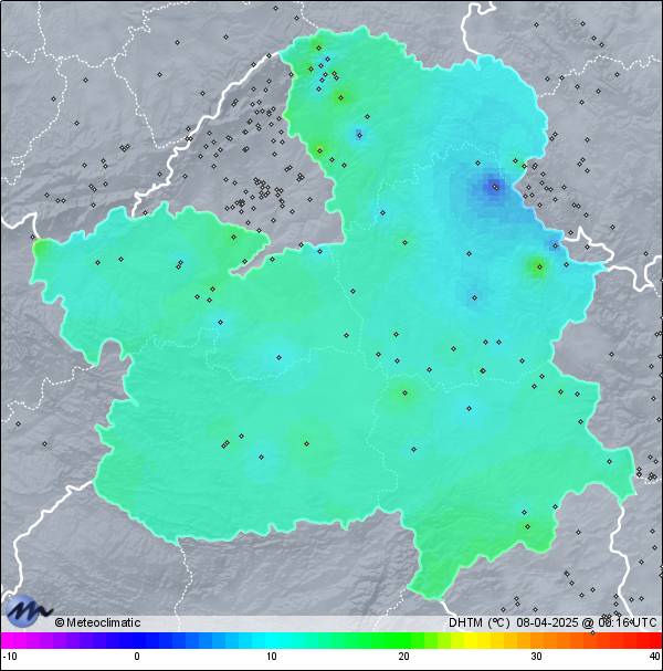 | 07-04-2025 | | | Máx. | Mín. | | | Temperatura | 19,7 | 0,2 | °C | | Humedad | 96 | 39 | % | | Viento | 11 | n/a | km/h | | Presión | 1.023 | 1.018 | hPa | | Precipitación | 0,0 | mm |