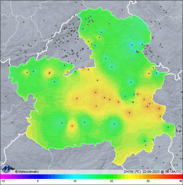 21-09-2025 | | Máx. | Mín. | | Temperatura | 25,9 | 12,5 | °C | Humedad | 96 | 37 | % | Viento | 35 | n/a | km/h | Precipitación | 0,0 | mm |