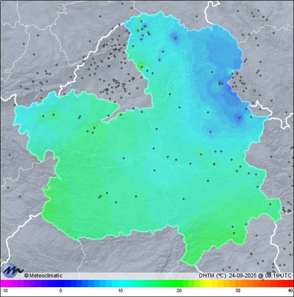 23-09-2025 | | Máx. | Mín. | | Temperatura | 12,8 | -2,3 | °C | Humedad | 91 | 33 | % | Viento | 15 | n/a | km/h | Precipitación | 0,0 | mm |