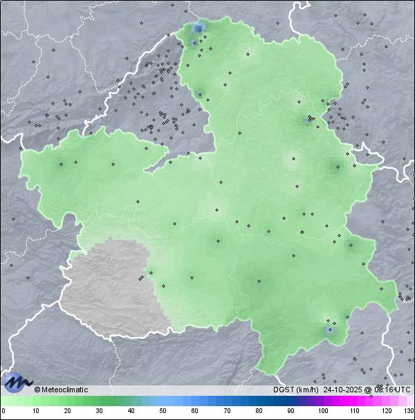 | 23-10-2025 | | | Máx. | Mín. | | | Temperatura | 17,8 | 12,1 | °C | | Humedad | 93 | 35 | % | | Viento | 72 | n/a | km/h | | Presión | 1.016 | 1.010 | hPa | | Precipitación | 0,2 | mm |