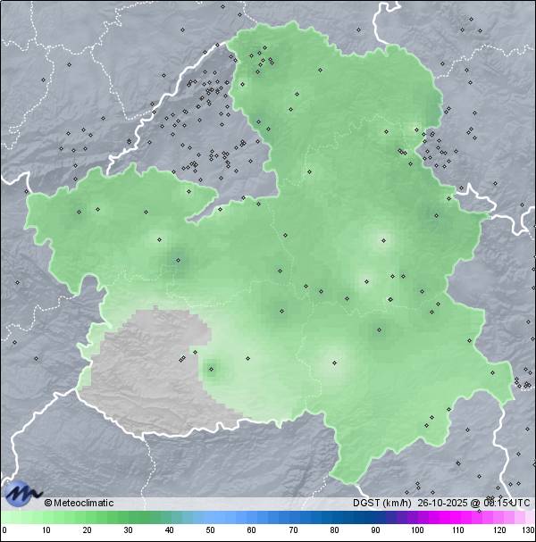 | Actualizado: 18:30 UTC | 9,5°C 83% | 14,0 °C / 89% |  | | 9,4°C / 79% | | Calma | | 32 km/h | | 1.015 hPa |