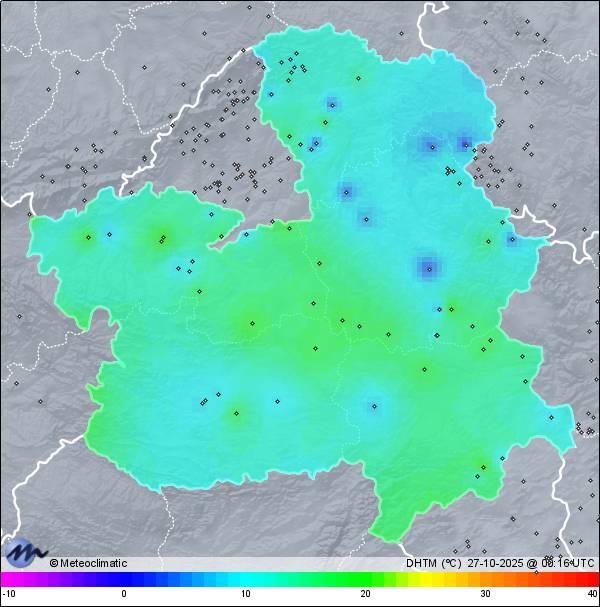 | 26-10-2025 | | | Máx. | Mín. | | | Temperatura | 9,2 | -1,8 | °C | | Humedad | 96 | 68 | % | | Viento | 11 | n/a | km/h | | Precipitación | 0,0 | mm |