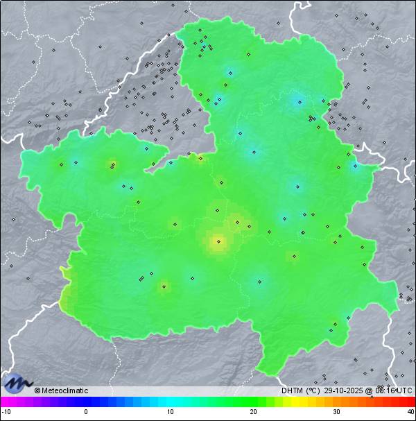 | 28-10-2025 | | | Máx. | Mín. | | | Temperatura | 19,1 | -1,4 | °C | | Humedad | 97 | 26 | % | | Viento | 11 | n/a | km/h | | Presión | 1.029 | 1.016 | hPa | | Precipitación | 0,0 | mm |