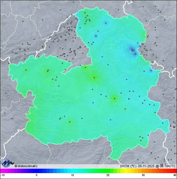 | 04-11-2025 | | | Máx. | Mín. | | | Temperatura | 14,9 | -2,0 | °C | | Humedad | 97 | 40 | % | | Viento | 9 | n/a | km/h | | Precipitación | 0,0 | mm |