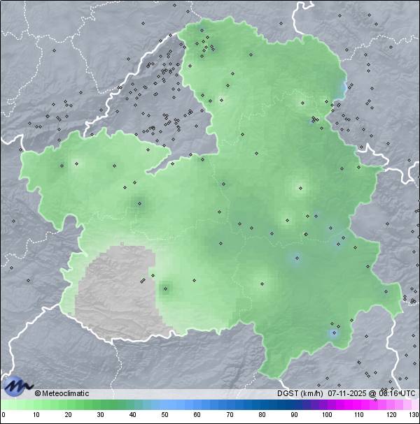 | 06-11-2025 | | | Máx. | Mín. | | | Temperatura | 8,2 | 4,6 | °C | | Humedad | 95 | 75 | % | | Viento | 45 | n/a | km/h | | Presión | 1.018 | 1.010 | hPa | | Precipitación | 0,6 | mm |