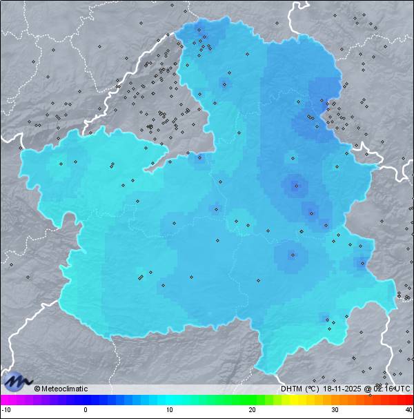 | Actualizado: 00:18 UTC | 7,4°C 95% | 7,5 °C / 96% |  | | 6,8°C / 94% | | Calma | | 4 km/h | | 1.017 hPa |