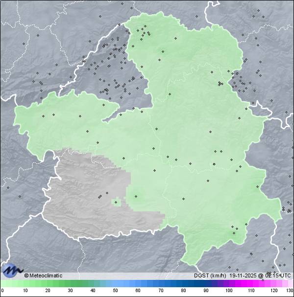 | Escarcha | | Actualizado: 00:47 UTC | -2,9°C 94% | -2,7 °C / 94% | | -3,2°C / 93% | | Calma | | 0 km/h | | 1.018 hPa |