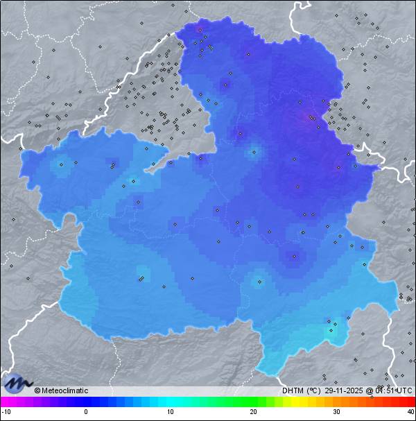 | Escarcha | | Actualizado: 00:15 UTC | -4,1°C 94% | -4,0 °C / 94% | | -4,1°C / 94% | | Calma | | 0 km/h | | 1.022 hPa |