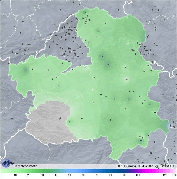 | Actualizado: 00:31 UTC | 5,5°C 91% | 6,4 °C / 92% | | 5,4°C / 90% | | Calma | | 5 km/h | | 1.021 hPa |