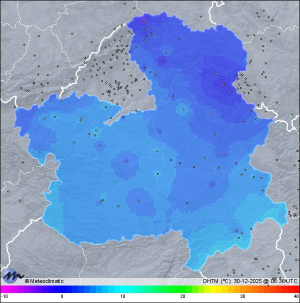 | Escarcha | | Actualizado: 01:30 UTC | -0,8°C 93% | 0,0 °C / 94% |  | | -0,8°C / 93% | | Calma | | 0 km/h | | 1.022 hPa |