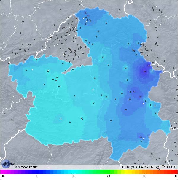 | Actualizado: 00:30 UTC | 3,5°C 81% | 3,9 °C / 81% |  | | 3,5°C / 73% | | 10 km/h ENE | | 39 km/h | | 1.017 hPa |