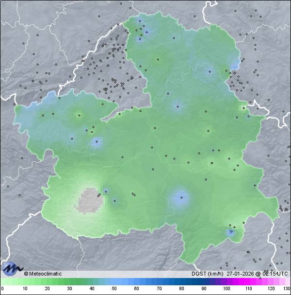 | Actualizado: 00:44 UTC | 9,0°C 79% | 9,2 °C / 82% | | 8,6°C / 77% | | 4 km/h E | | 11 km/h | | 1.011 hPa |