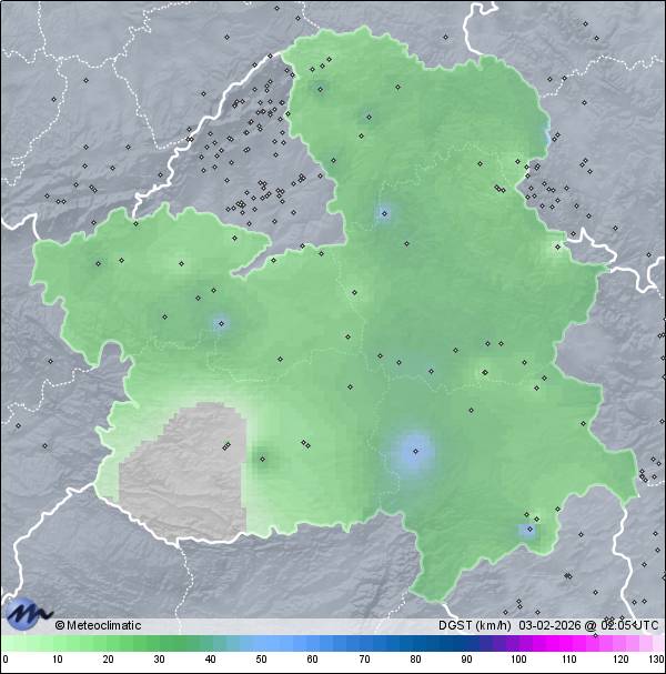 | Actualizado:02-02-2026 22:46 UTC | 6,6°C 71% | 15,5 °C / 86% | | 5,8°C / 52% | | 8 km/h SSW | | 55 km/h | | 1.003 hPa | | 0,2 mm |