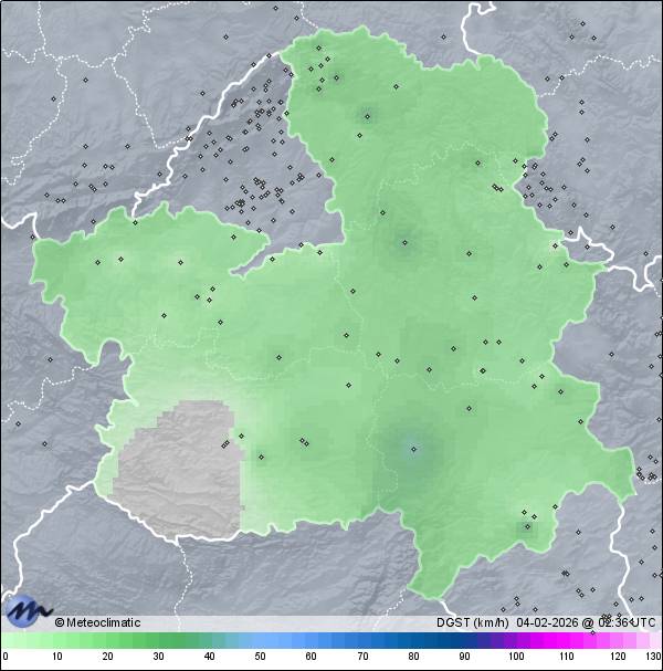 | Actualizado: 00:30 UTC | 3,4°C 77% | 4,1 °C / 80% | | 2,1°C / 74% | | 991 hPa |