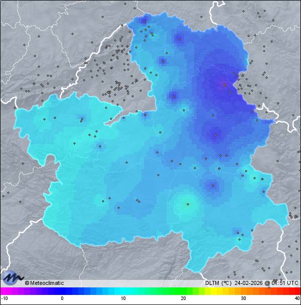 | Actualizado: 00:04 UTC | 3,6°C 64% | 4,1 °C / 66% | | 3,1°C / 62% | | 5 km/h NE | | 8 km/h | | 1.027 hPa |