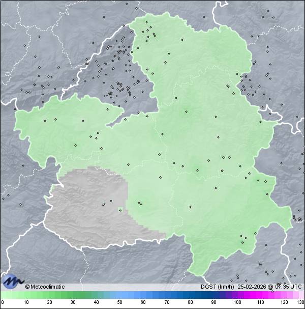 | Actualizado:24-02-2026 23:58 UTC | 9,9°C 63% | 21,6 °C / 83% | | 3,7°C / 29% | | 2 km/h E | | 17 km/h | | 1.021 hPa |