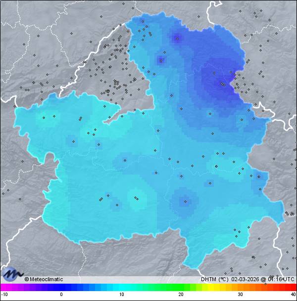 | Actualizado: 00:03 UTC | 10,1°C 90% | 10,9 °C / 90% | | 9,6°C / 87% | | 2 km/h ENE | | 5 km/h | | 1.025 hPa |