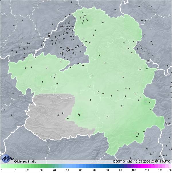 | Actualizado:12-03-2026 23:45 UTC | 5,2°C 83% | 19,4 °C / 92% | | 0,3°C / 36% | | Calma | | 18 km/h | | 1.024 hPa |