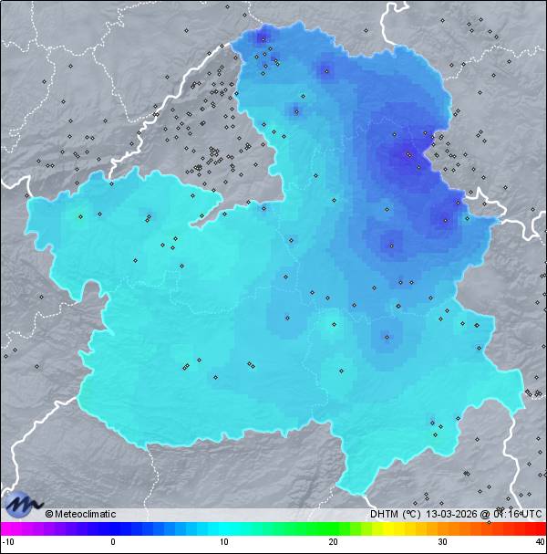 | Escarcha | | Actualizado:12-03-2026 23:58 UTC | -4,2°C 93% | 15,8 °C / 95% | | -9,0°C / 30% | | Calma | | 15 km/h | | 1.032 hPa |