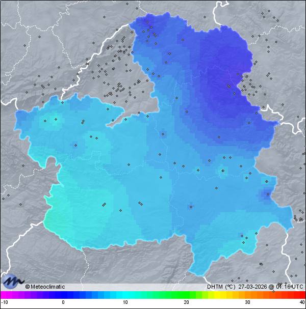 | Actualizado:26-03-2026 23:58 UTC | 5,2°C 61% | 12,1 °C / 75% | | 4,7°C / 47% | | 6 km/h NNE | | 40 km/h | | 1.022 hPa |