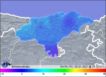 | 05-01-2021 | | | Máx. | Mín. | | | Temperatura | 5,4 | 2,4 | °C | | Humedad | 97 | 94 | % | | Viento | 32 | n/a | km/h | | Presión | 1.015 | 1.013 | hPa | | Precipitación | 34,0 | mm |