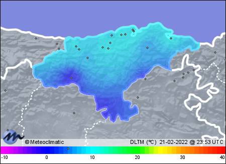 | 21-02-2022 | | | Máx. | Mín. | | | Temperatura | 14,4 | 8,9 | °C | | Humedad | 93 | 76 | % | | Viento | 37 | n/a | km/h | | Presión | 1.035 | 1.029 | hPa | | Precipitación | 0,0 | mm |