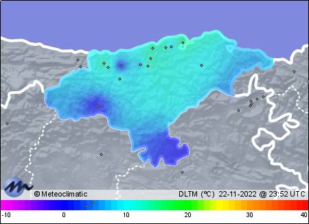 | 22-11-2022 | | | Máx. | Mín. | | | Temperatura | 15,7 | 6,9 | °C | | Humedad | 86 | 64 | % | | Viento | 37 | n/a | km/h | | Presión | 1.013 | 1.003 | hPa | | Precipitación | 1,2 | mm |