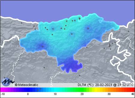 | 20-02-2023 | | | Máx. | Mín. | | | Temperatura | 16,5 | 9,4 | °C | | Humedad | 93 | 68 | % | | Viento | 25 | n/a | km/h | | Presión | 1.027 | 1.018 | hPa | | Precipitación | 0,0 | mm |