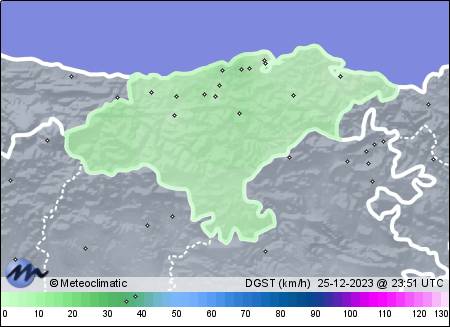 | 25-12-2023 | | | Máx. | Mín. | | | Temperatura | 17,5 | 4,0 | °C | | Humedad | 84 | 45 | % | | Viento | 22 | n/a | km/h | | Presión | 1.027 | 1.023 | hPa | | Precipitación | 0,0 | mm |