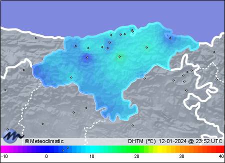 | 12-01-2024 | | | Máx. | Mín. | | | Temperatura | 11,3 | 5,9 | °C | | Humedad | 91 | 67 | % | | Viento | 18 | n/a | km/h | | Presión | 1.030 | 1.024 | hPa | | Precipitación | 0,3 | mm |