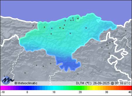 | 25-09-2025 | | | Máx. | Mín. | | | Temperatura | 19,3 | 9,9 | °C | | Humedad | 90 | 62 | % | | Viento | 18 | n/a | km/h | | Presión | 1.026 | 1.023 | hPa | | Precipitación | 0,0 | mm |