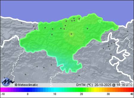 Actualizado: 13:19 UTC | 19,0°C 83% | 19,6 °C / 98% |  | 12,5°C / 74% | | 3 km/h NNW | 16 km/h | 1.008 hPa |