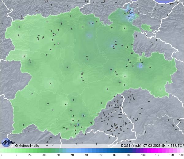 | Actualizado: 13:13 UTC | 7,5°C 88% | 7,5 °C / 98% | | 3,3°C / 87% | | 3 km/h ENE | | 30 km/h | | 1.021 hPa | | 4,3 mm |