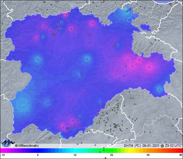 | 06-01-2021 | | | Máx. | Mín. | | | Temperatura | 6,7 | -1,7 | °C | | Humedad | 99 | 76 | % | | Presión | 1.018 | 1.015 | hPa |
