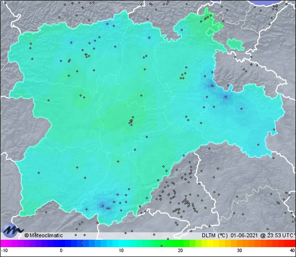 | 01-06-2021 | | | Máx. | Mín. | | | Temperatura | 21,4 | 12,8 | °C | | Humedad | 95 | 65 | % | | Viento | 35 | n/a | km/h | | Presión | 1.010 | 1.005 | hPa | | Precipitación | 5,8 | mm |