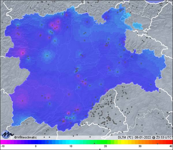 | 08-01-2022 | | | Máx. | Mín. | | | Temperatura | 9,4 | 2,8 | °C | | Humedad | 95 | 67 | % | | Presión | 1.032 | 1.022 | hPa |