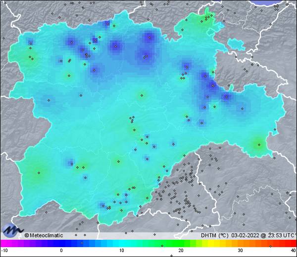 | 03-02-2022 | | | Máx. | Mín. | | | Temperatura | 12,9 | -2,7 | °C | | Humedad | 97 | 47 | % | | Viento | 31 | n/a | km/h | | Presión | 1.025 | 1.021 | hPa | | Precipitación | 0,0 | mm |