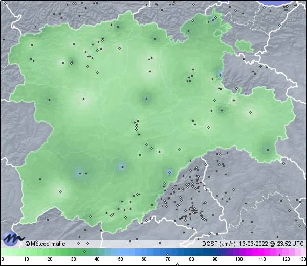 | 13-03-2022 | | | Máx. | Mín. | | | Temperatura | 8,4 | -0,9 | °C | | Humedad | 95 | 46 | % | | Viento | 32 | n/a | km/h | | Presión | 1.013 | 1.007 | hPa | | Precipitación | 2,0 | mm |