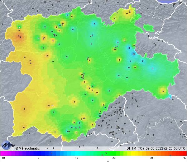 | 09-05-2022 | | | Máx. | Mín. | | | Temperatura | 23,4 | -3,9 | °C | | Humedad | 92 | 20 | % | | Viento | 32 | n/a | km/h | | Presión | 1.029 | 1.024 | hPa | | Precipitación | 0,0 | mm |