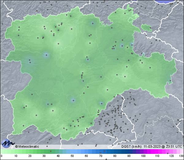| 11-03-2023 | | | Máx. | Mín. | | | Temperatura | 12,0 | 8,3 | °C | | Humedad | 96 | 74 | % | | Viento | 43 | n/a | km/h | | Presión | 1.023 | 1.021 | hPa | | Precipitación | 0,5 | mm |