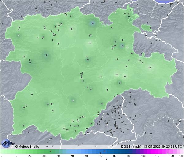 | 13-05-2023 | | | Máx. | Mín. | | | Temperatura | 13,4 | 3,0 | °C | | Humedad | 88 | 53 | % | | Viento | 45 | n/a | km/h | | Presión | 1.023 | 1.021 | hPa | | Precipitación | 0,0 | mm |