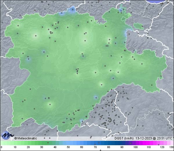 | 13-12-2023 | | | Máx. | Mín. | | | Temperatura | 8,8 | 3,2 | °C | | Humedad | 94 | 67 | % | | Viento | 41 | n/a | km/h | | Presión | 1.025 | 1.017 | hPa |