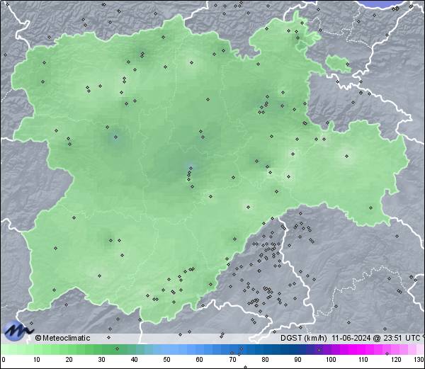 | 11-06-2024 | | | Máx. | Mín. | | | Temperatura | 15,4 | 2,0 | °C | | Humedad | 99 | 66 | % | | Viento | 31 | n/a | km/h |