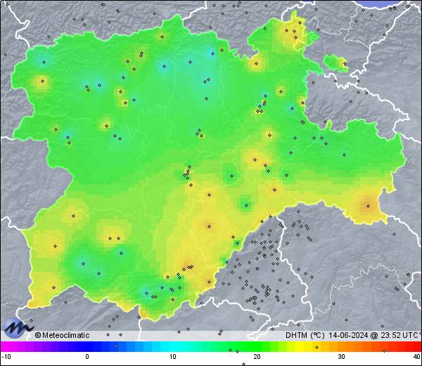 | 14-06-2024 | | | Máx. | Mín. | | | Temperatura | 23,2 | 8,1 | °C | | Humedad | 98 | 39 | % | | Viento | 35 | n/a | km/h | | Presión | x | x | hPa | | Precipitación | 0,0 | mm |